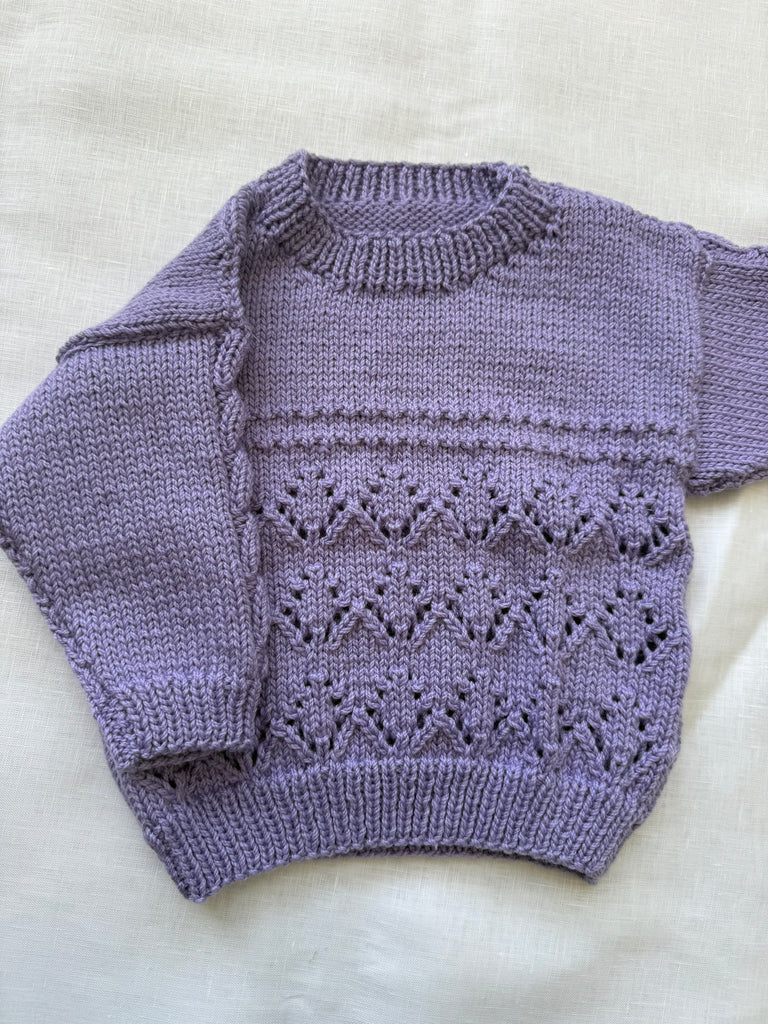 100% Wool hand knitted textured jumper with button in shoulder for extra headspace when taking in and off. Wool is luxury 8ply from the Bendigo Woollen Mills