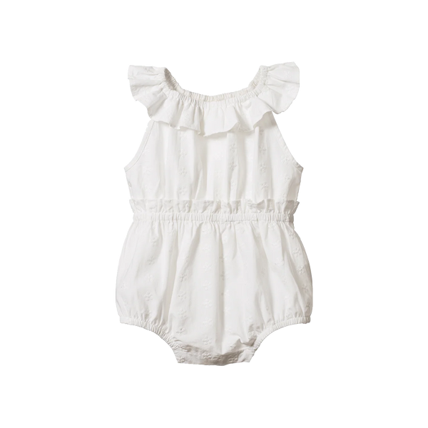Dress your little one in the beautiful Plum Suit, crafted from organic cotton woven fabric. Featuring the sweetest floral Broderie Anglaise pattern. The collar features an elastic frill detail, and the billowy fit allows for easy movement.