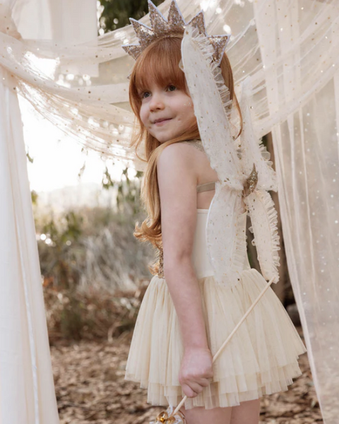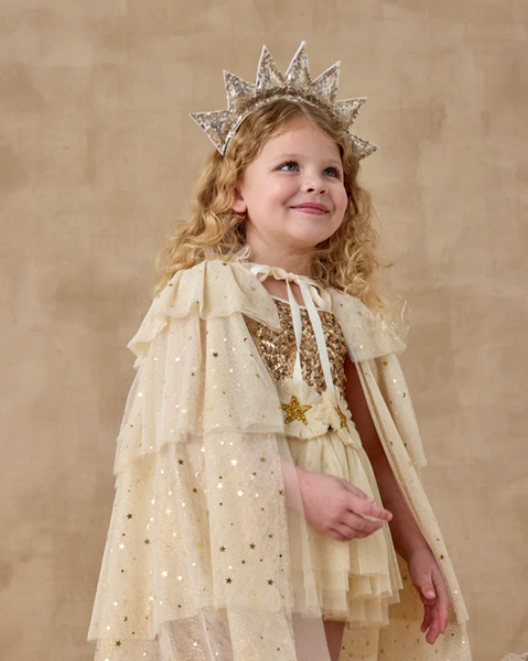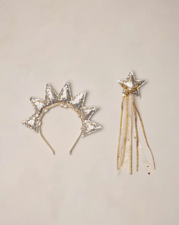 No dress-up look is complete without our sun crown ribboned headband and star wand crafted from a wooden dowel and adorned with a tinkling bell and flowing tulle ribbon perfect for every royal occasion.