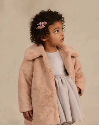 The new Eloise Coat has hidden snaps along the center front and pockets at the front. With a darling full collar, this slight oversized cut fuax fur coat will keep your little one warm this season.