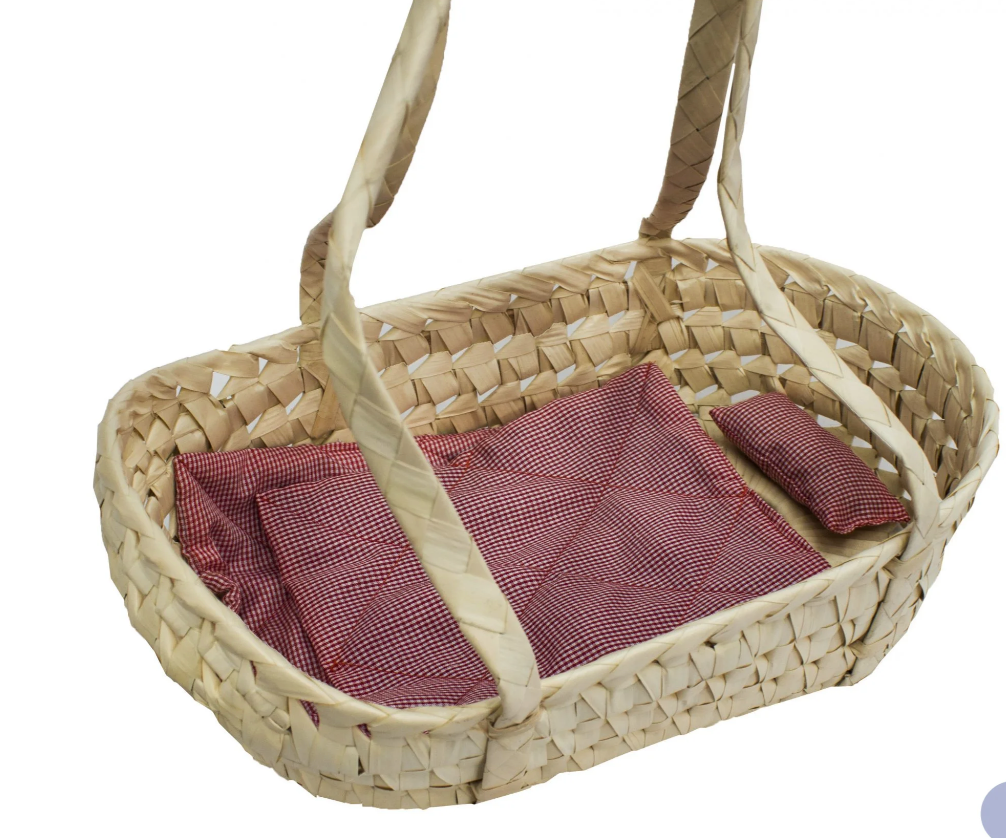 This woven seagrass doll carrier is perfect for your little ones to carry around their dolls. Our seagrass carrier includes bedding (a red blanket and a pillow) with a double handle. Enhancing Imaginative play encourages children to express themselves through role-play and develop a sense of identity. Imaginative play also develops language and communication skills along with learning to listen and negotiate with others.