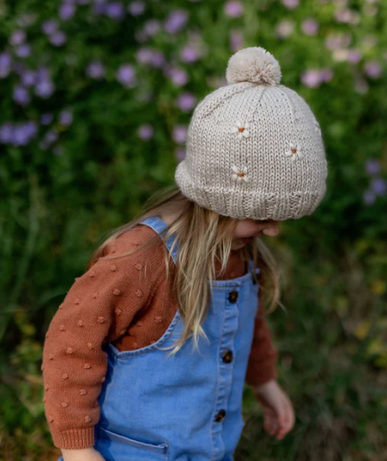 This gorgeous hand-knitted beanie features an adorable daisy embroidered pattern on the front. Its soft and stretchy ribbing around the face ensures a gentle and snug fit. Plus, a cute pom pom on top adds the finishing touch.