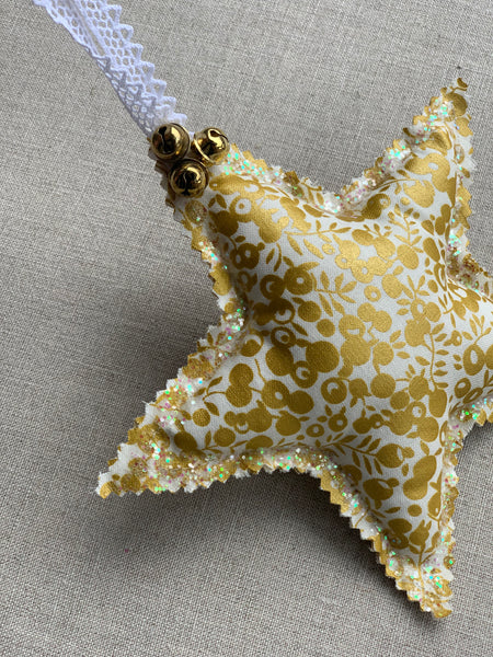 A sweet fabric star made of a genuine Liberty and trimmed with clear sequin for added sparkle. Adorn your tree or decorate your home. Includes lace string to hang and bell decorative feature.