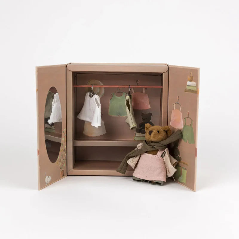 A little bear needs dressing! Open the soft wooden doors to find six delightful outfits hanging on tiny hangers. Each morning becomes a gentle adventure choosing what to wear.