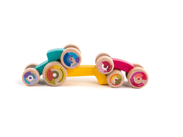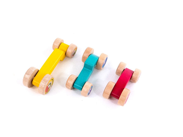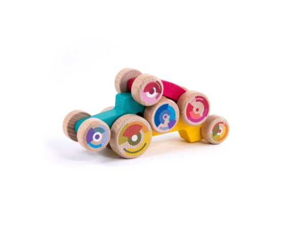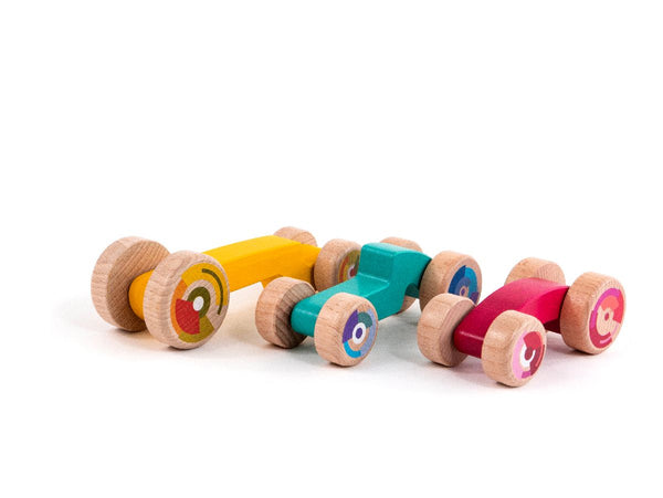 Size of the cars: Magenta car: 12 cm x 6 cm x 4,7 cm Yellow car: 18 cm x 6 cm x 5,5 cm Light blue car: 13,8 cm x 6 cm x 5 cm Materials:Bodies: Sycamore / Wheels: Beechwood Box: 25 cm x 10,5 cm x 6,7 cm 3 stackable cars Recommended for children over 18 months old