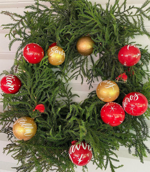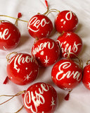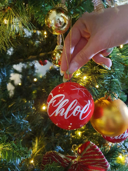 Available in two colours, shiny red and gold, with hand lettering by Eliza Svikulis. Please include the name to be written on the bauble in the Notes section when checking out. Strictly Limited number available so get in quick! Please note that only single names will be written on the baubles.