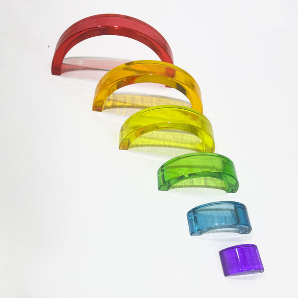 The Lucite Rainbow adds lots of colour and sparkle, especially when used with sunlight streaming thru, or on the light table. Please note: this product is not suitable for under 3's, and needs to be played with on the floor or on a carpet or a table with carpet underneath: if it drops onto a hard floor like concrete it may break.