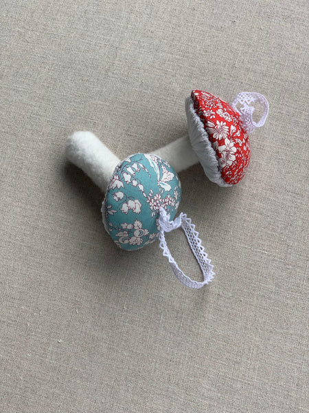 A sweet fabric mushroom made of a genuine Liberty top and felt stalk. Adorn your tree or decorate your home. Includes lace string to hang.